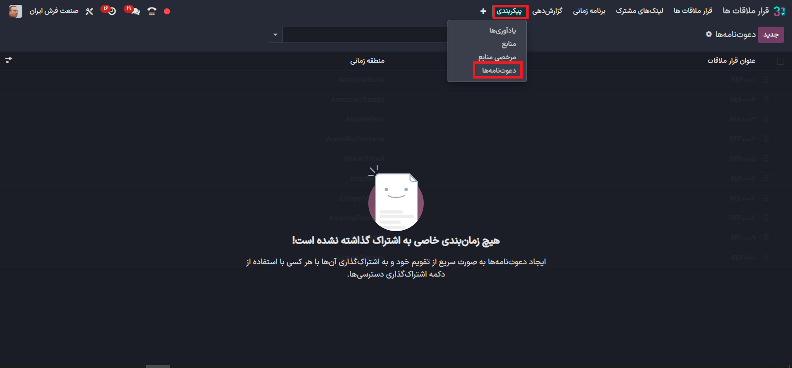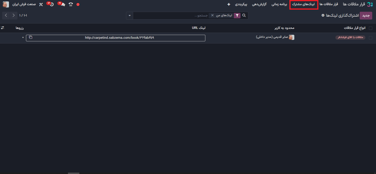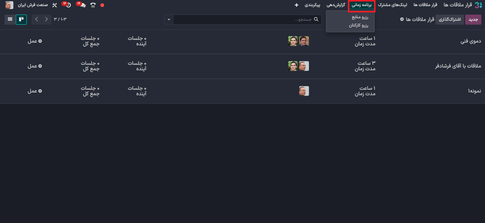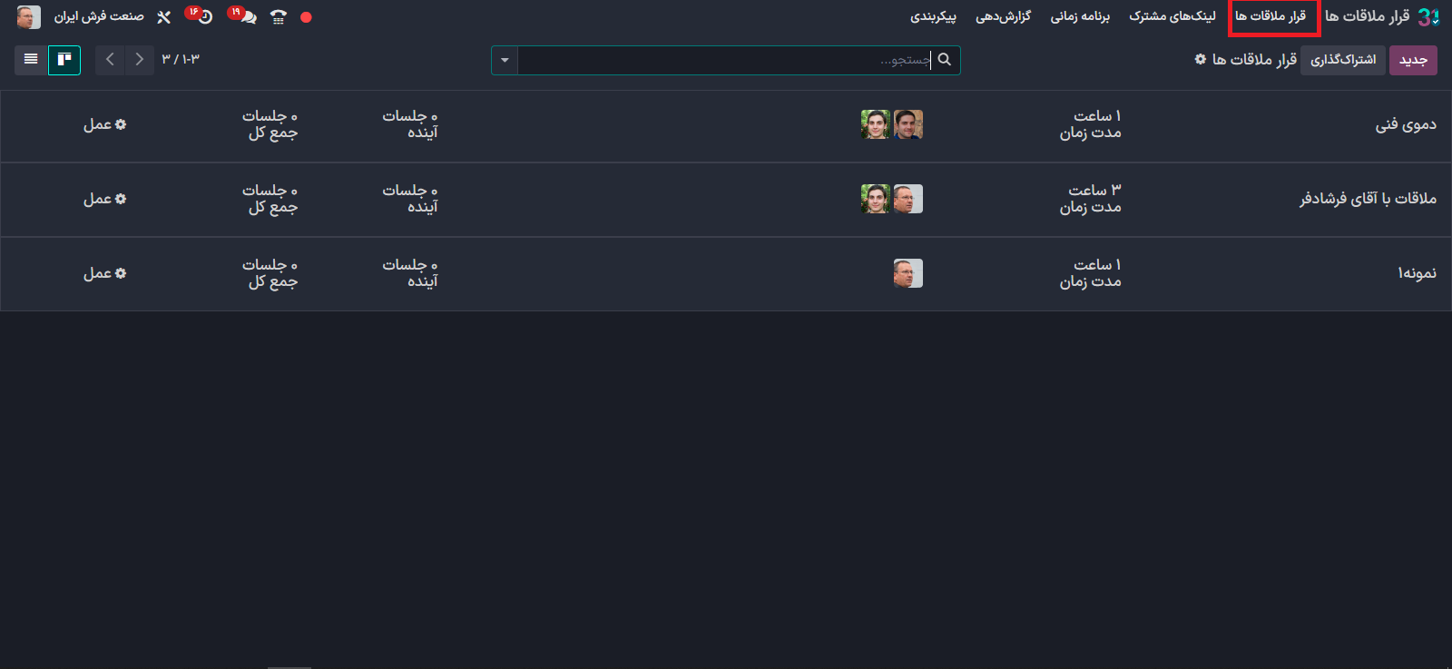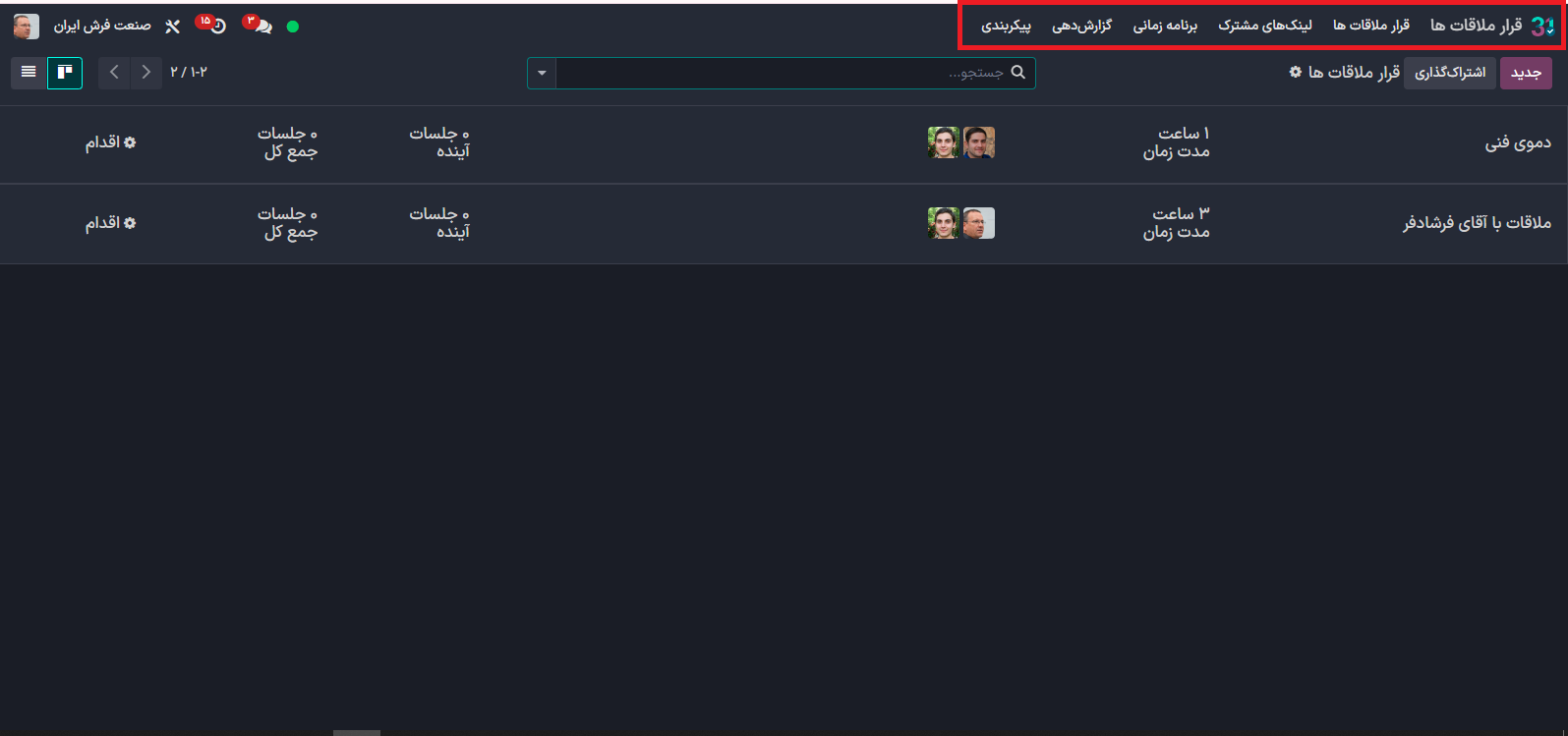 وارد ماژول قرار ملاقات شوید، در بالای صفحه چند بخش مهم وجود دارد.