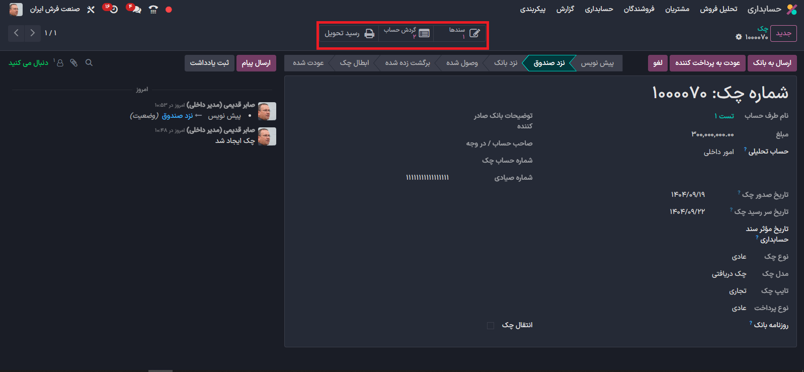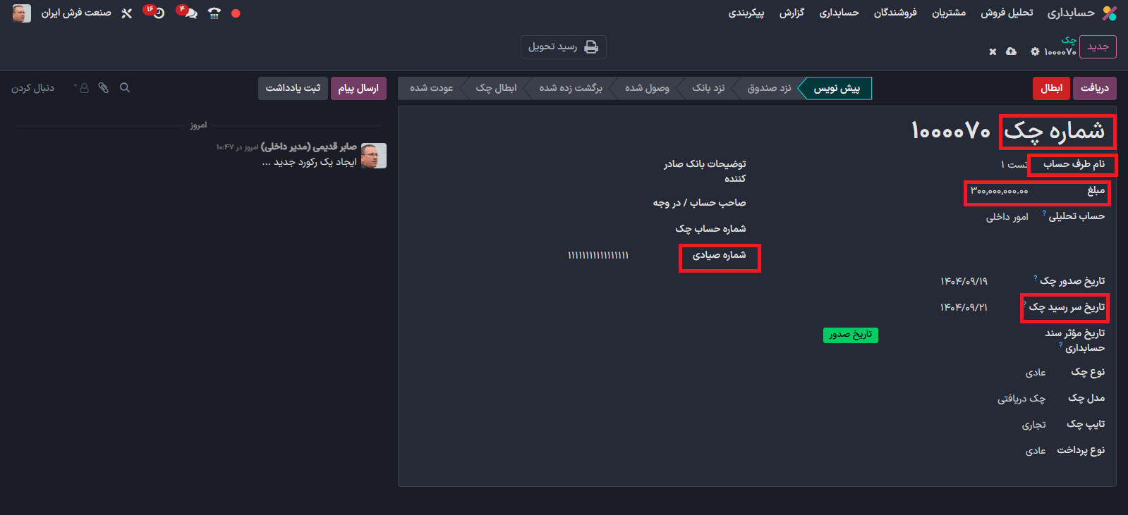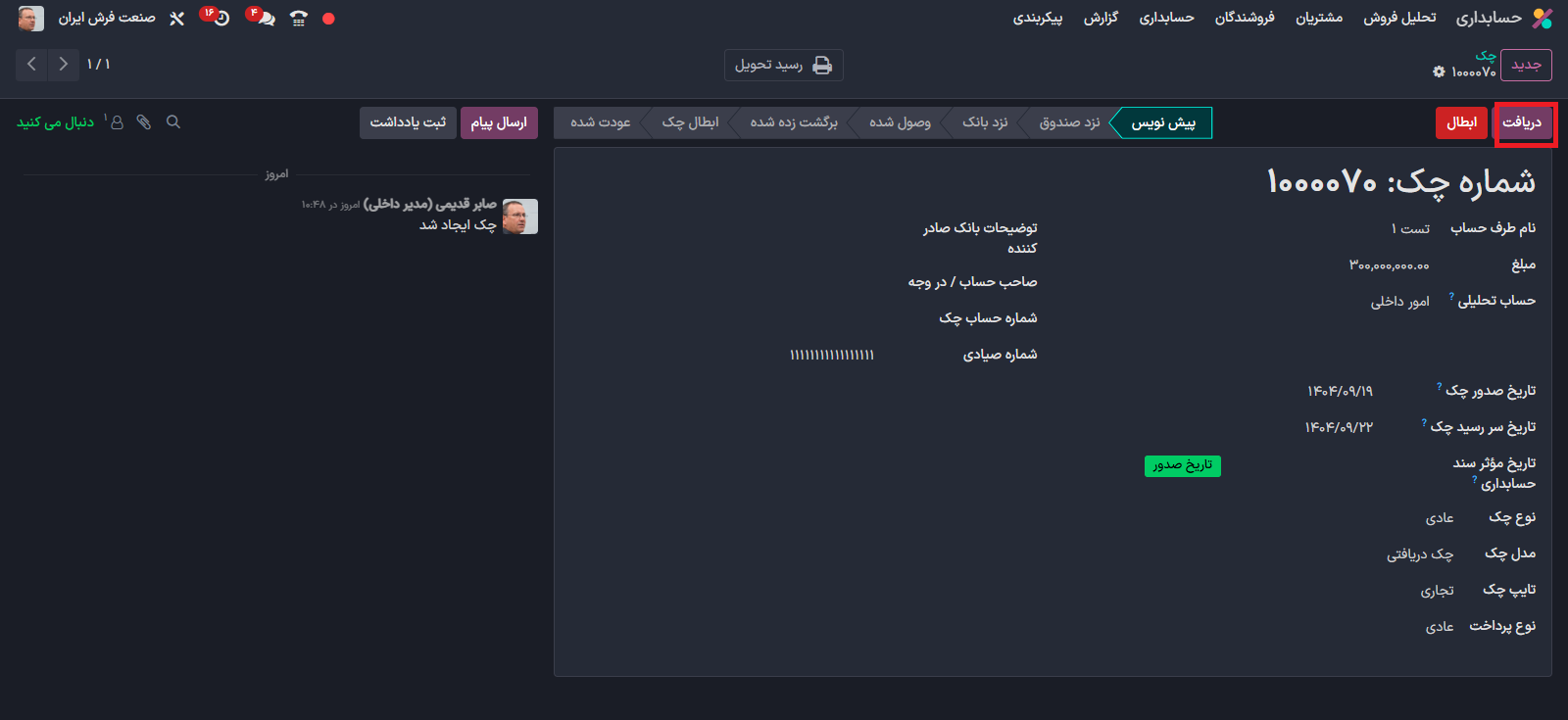 به این ترتیب شما می توانید چک دریافت شده را ثبت کنید.