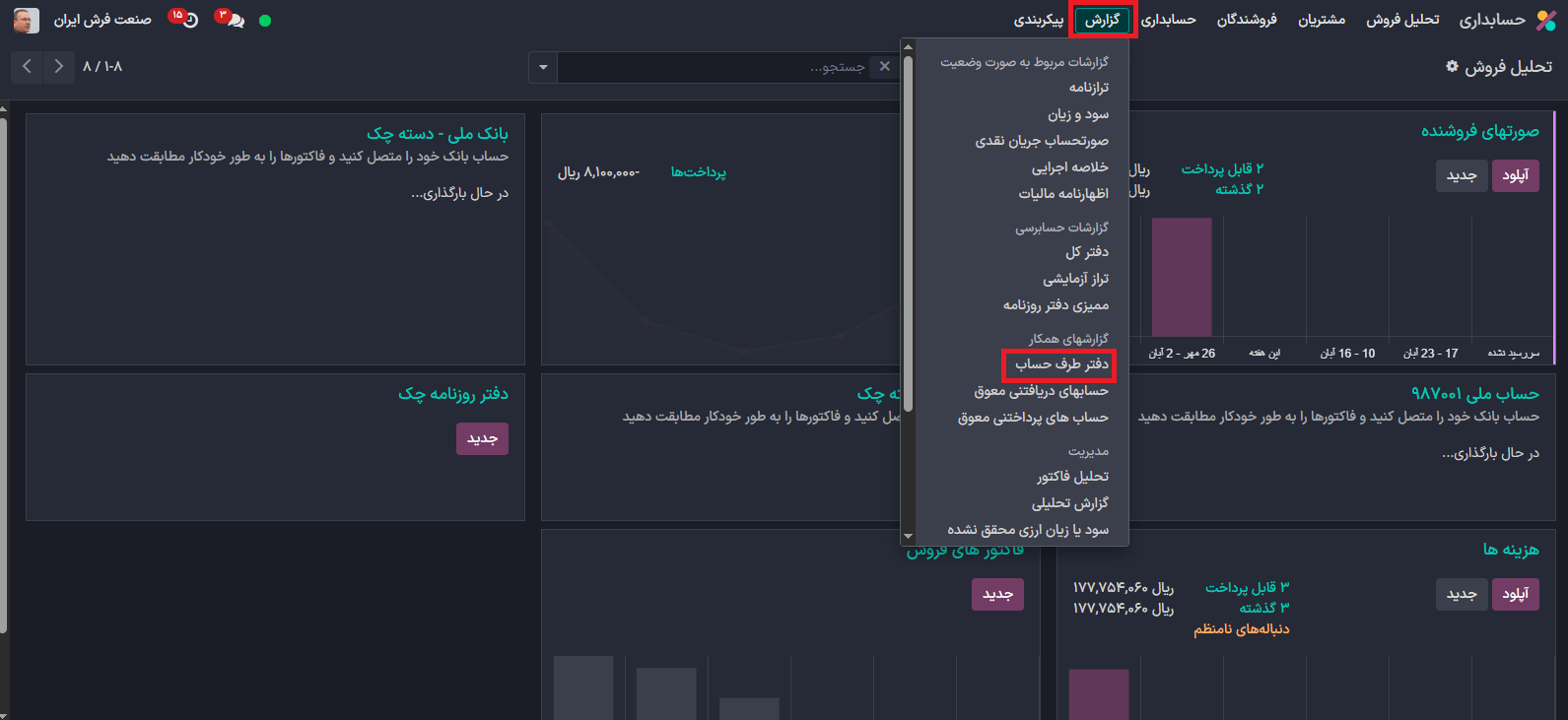 در این قسمت با کلیک کردن بر روی گزارش قسمت دفتر طرف حساب را انتخاب کنید.