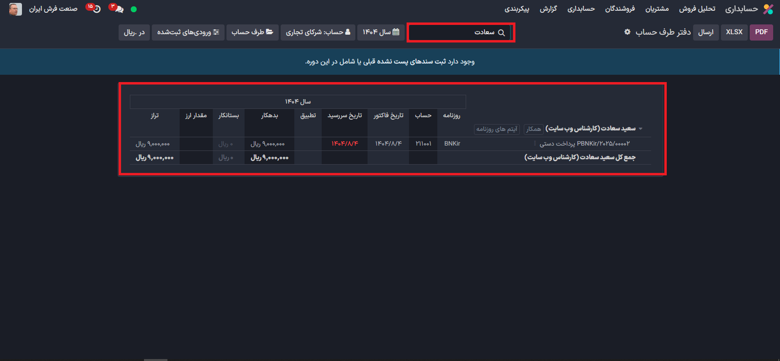 در این قسمت می توان گردش و مانده شخص مد نظر خود را در حساب های با ماهیت دریافتنی و پرداختنی، مشاهده کنید.