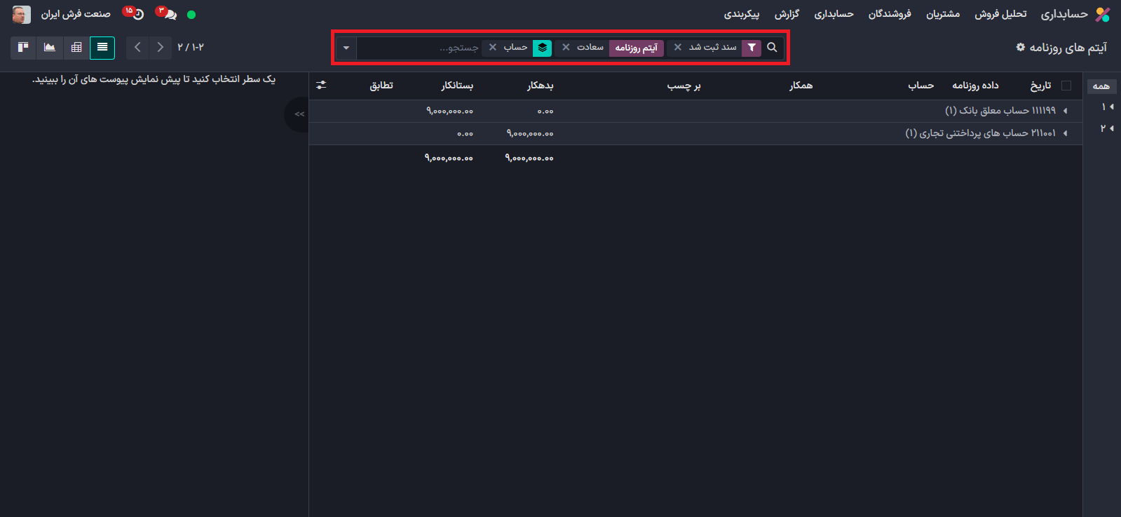 با قرار دادن این فیلتر ها حساب ها و سند های شخص مورد نظر را مشاهده می کنیم و می توانیم گزارش تهیه کنیم.