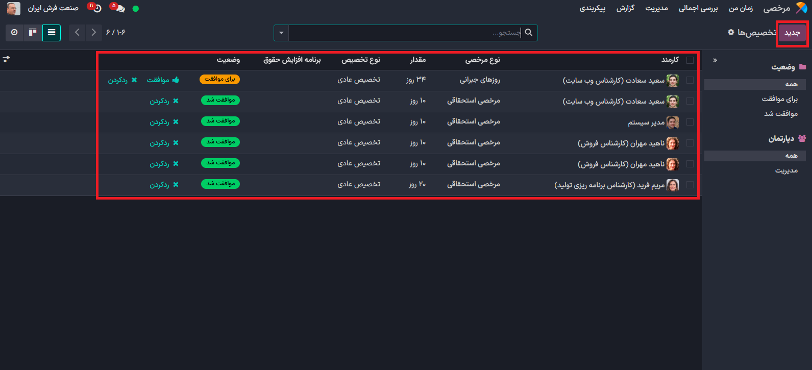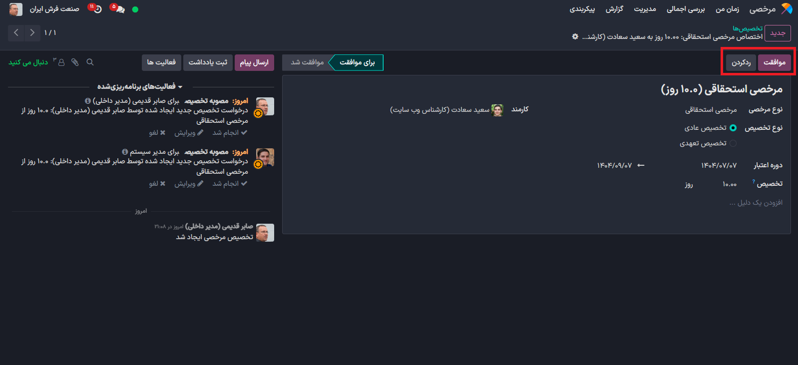 سپس بعد از ذخیره توسط مدیر موافقت یا رد می شود و پس از تایید توسط مدیر منابع انسانی کارمند می تواند درخواست مرخصی خود را ثبت کند.