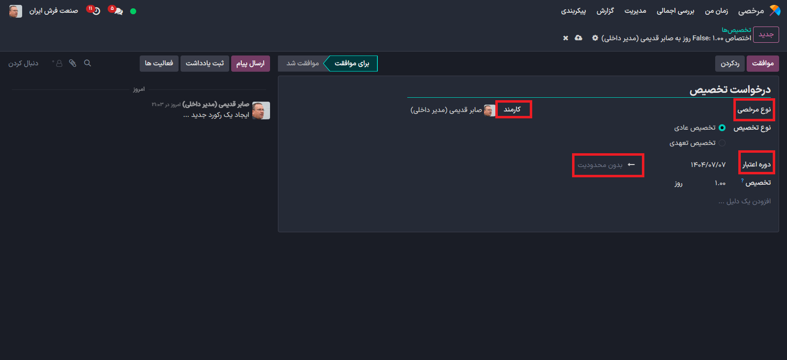 در این قسمت شرح تخصیص را نوشته و نوع مرخصی و کارمند را مشخص می کنید.