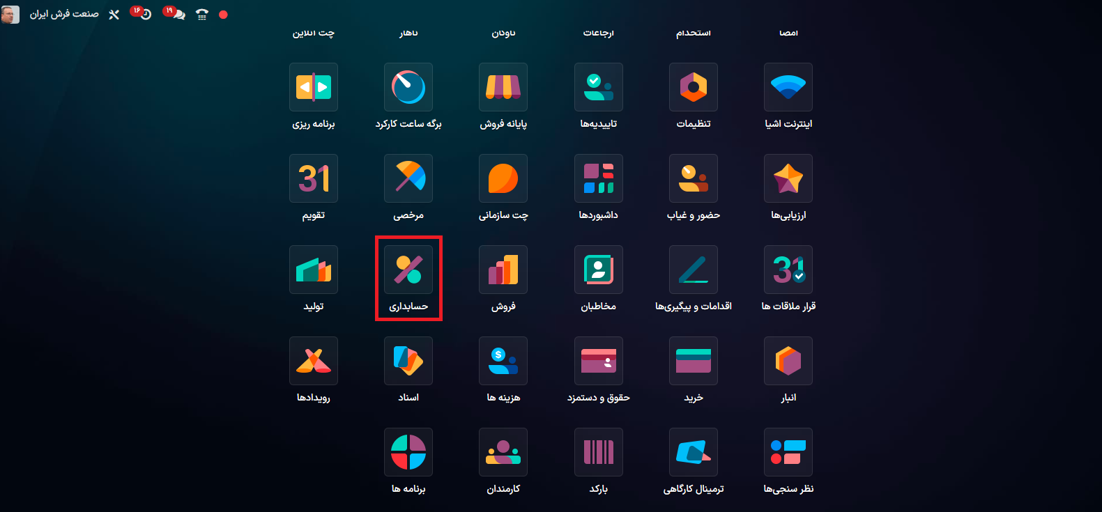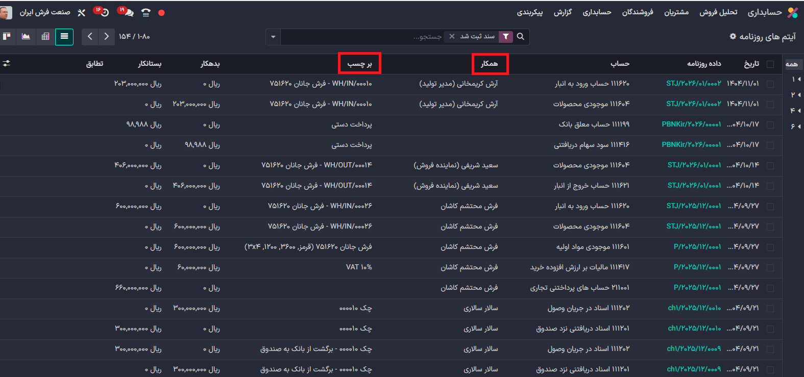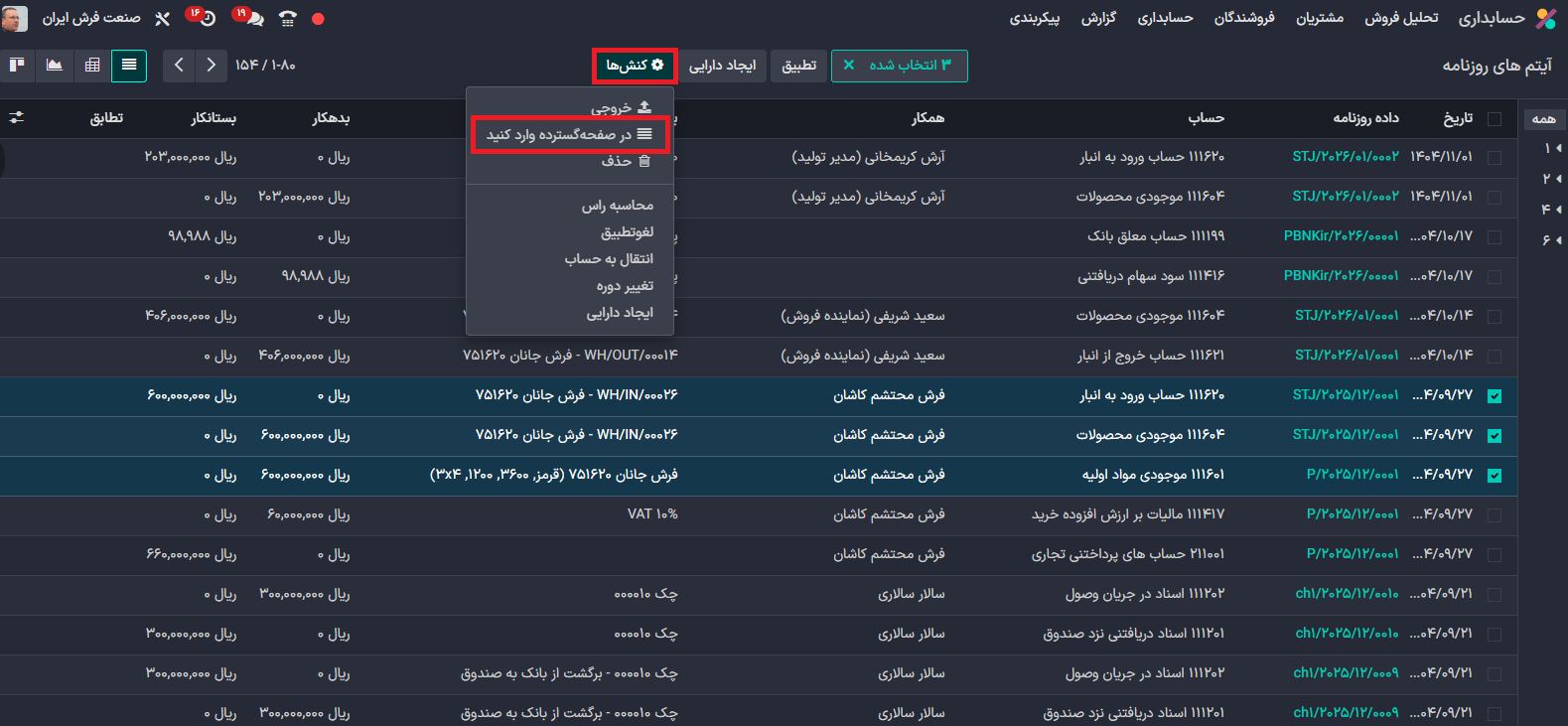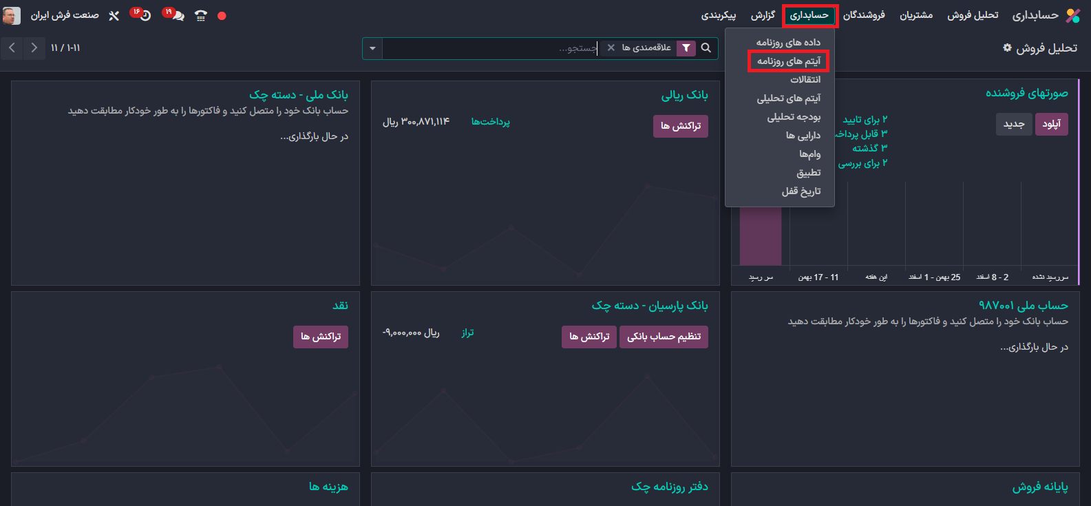 از منو حسابداری آیتم های روزنامه را انتخاب کنید.