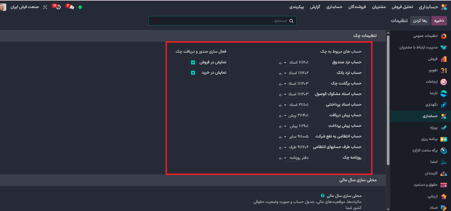 برای اینکه بخواهید در تسویه فاکتور های خرید و فروش از چک استفاده کنید، تیک آن ها را در قسمت فعال سازی صدور و دریافت چک فعال کنید.