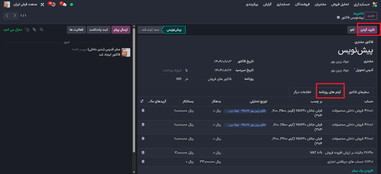 در این قسمت شما می توانید این فاکتور را تایید کنید، و در قسمت آیتم های روزنامه سند حسابداری این فاکتور را مشاهده کنید.