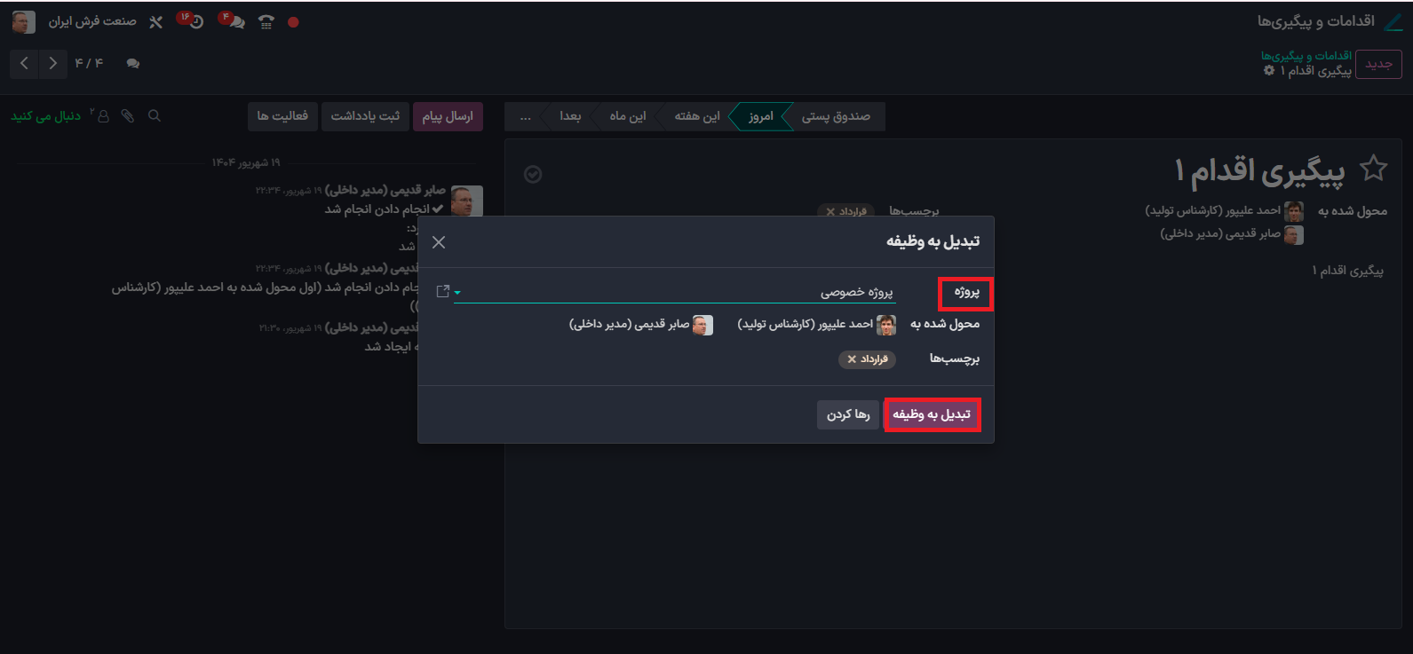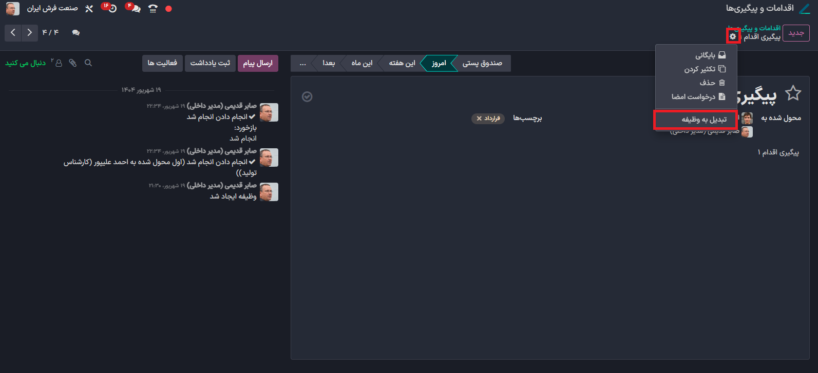 با انجام این کار، اقدام انتخاب‌شده به‌صورت خودکار به یک وظیفه در ماژول پروژه منتقل می‌شود. این قابلیت به شما کمک می‌کند تا فعالیت‌های ثبت‌شده را در قالب وظایف پروژه سازمان‌دهی کرده و مدیریت دقیق‌تری بر روند انجام کارها داشته باشید.