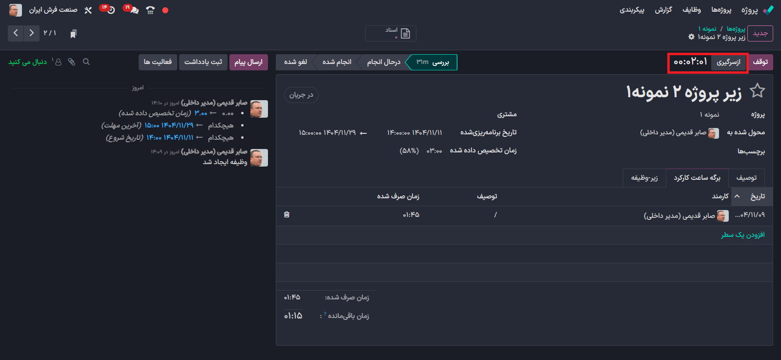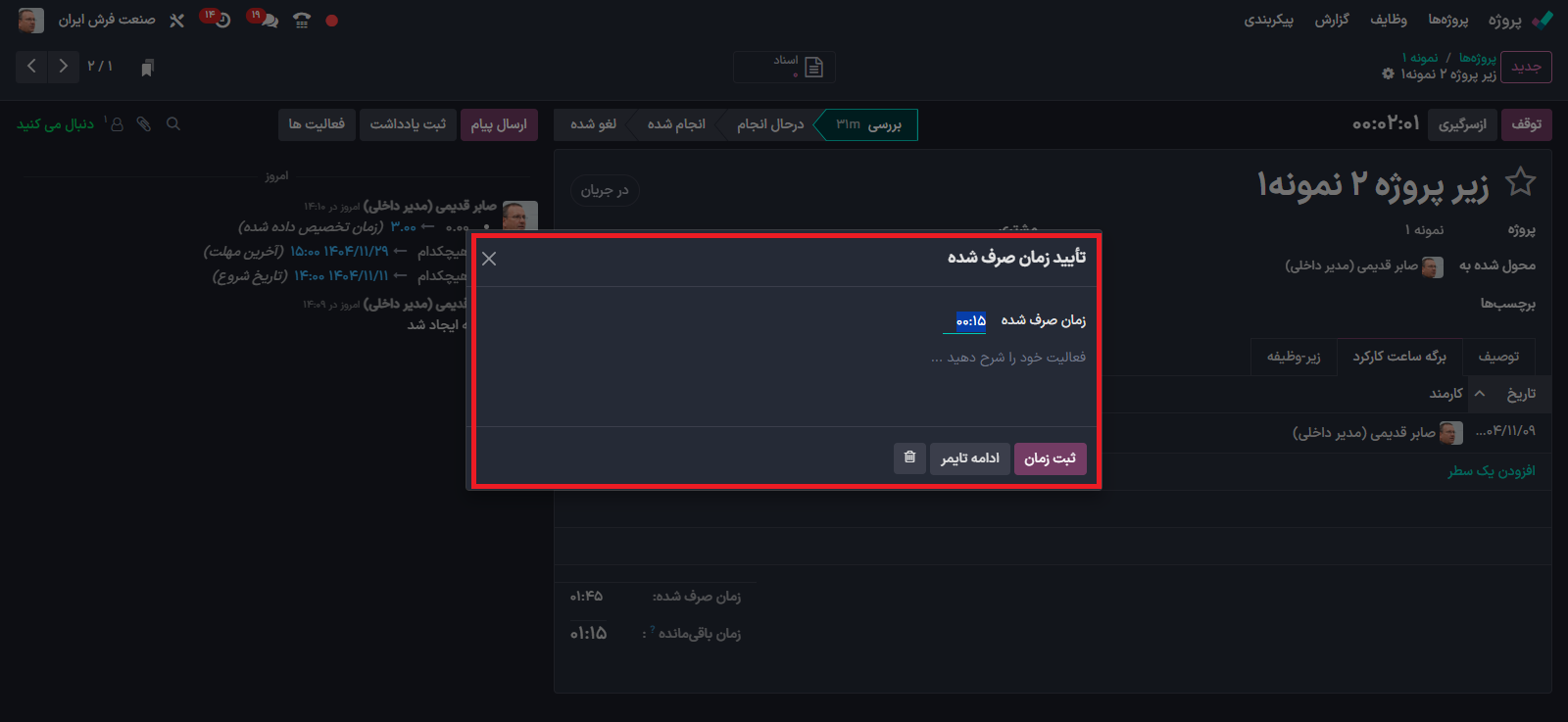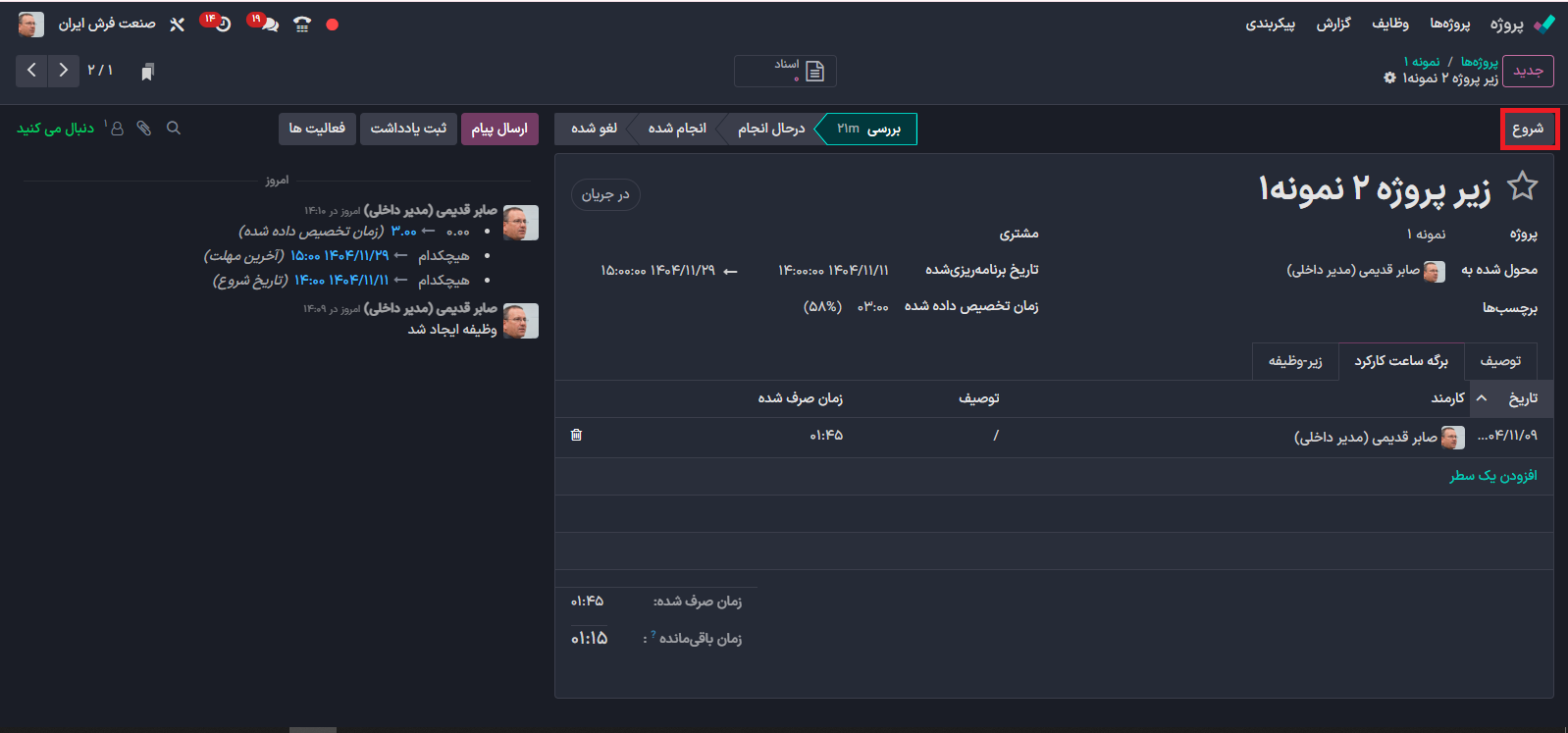 در زمان شروع کار بر روی قسمت شروع کلیک کنید تا به صورت خودکار مدت زمان صرف شده  محاسبه گردد.