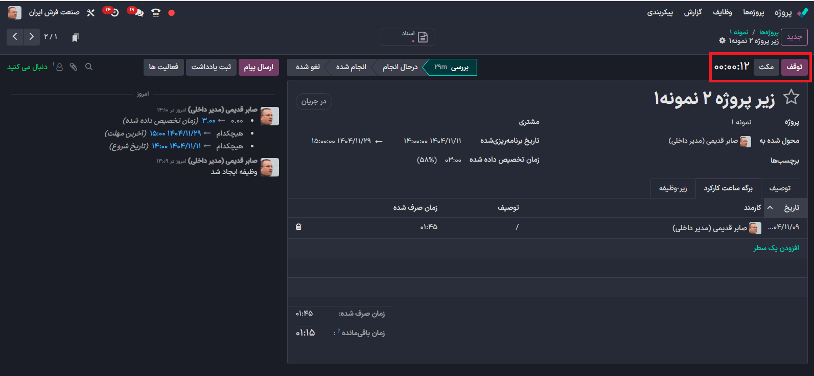 وارد قسمت برگه ساعت کارکرد شوید و روی افزودن یک سطر کلیک کنید و برای این وظیفه مدت زمان استفاده شده در این پروژه  را وارد کنید.
