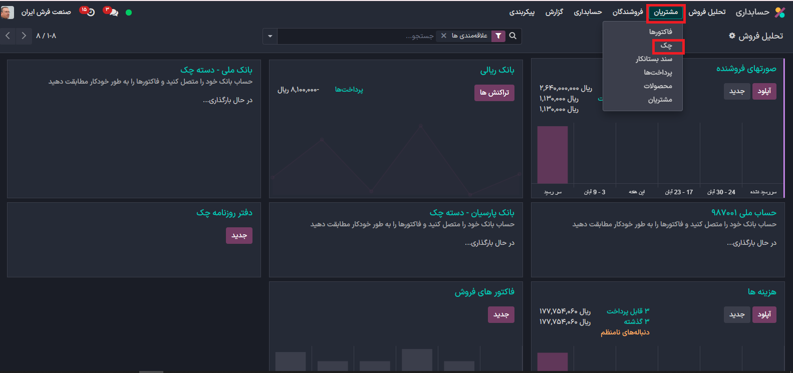 از منو مشتریان چک را انتخاب کنید.
