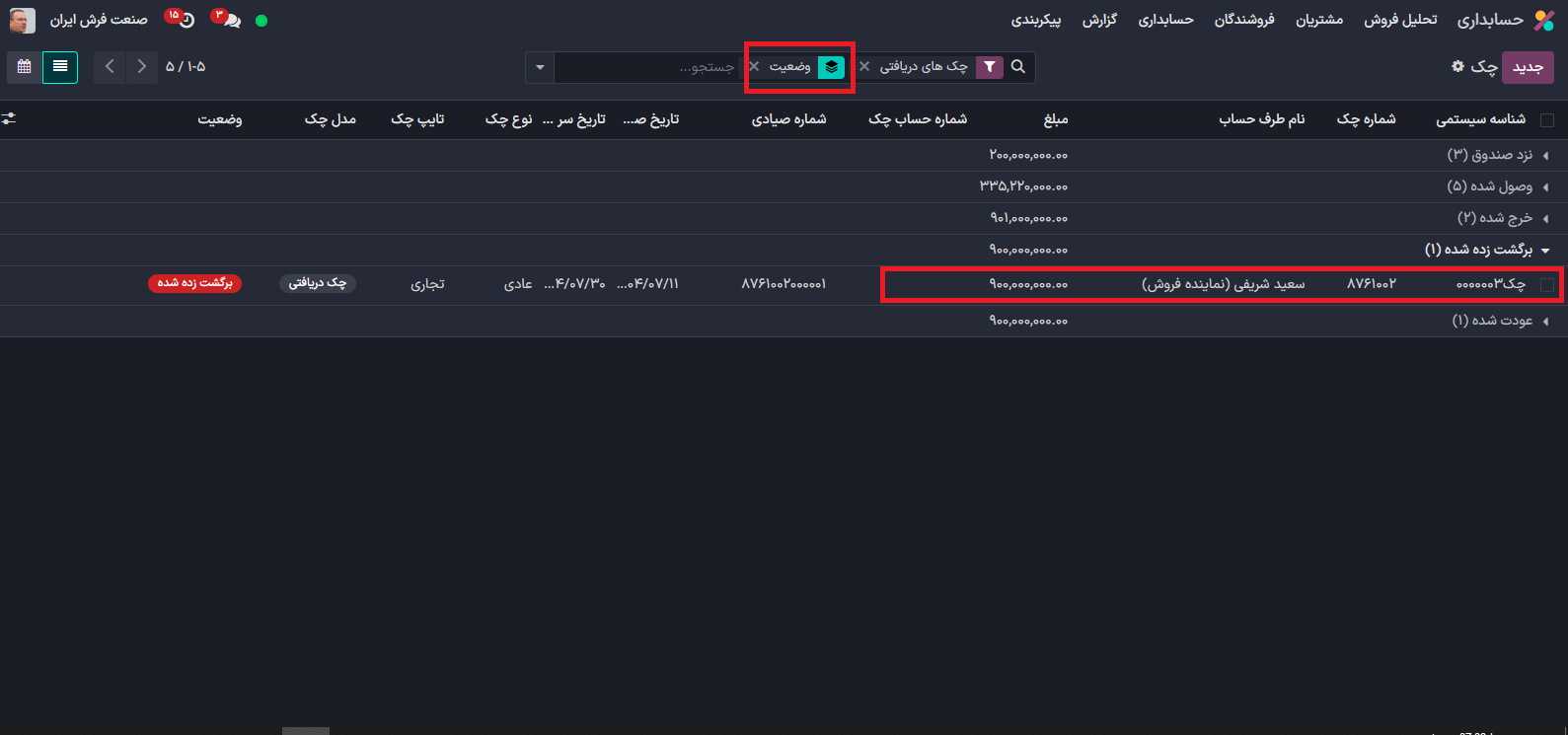 می توانید بر اساس وضعیت دسته بندی کنید. چک مورد نظر را انتخاب کنید و روی آن کلیک کنید.