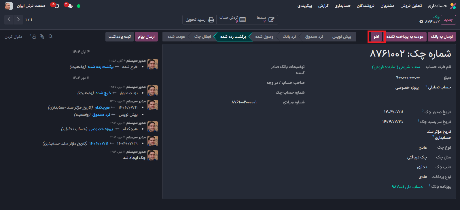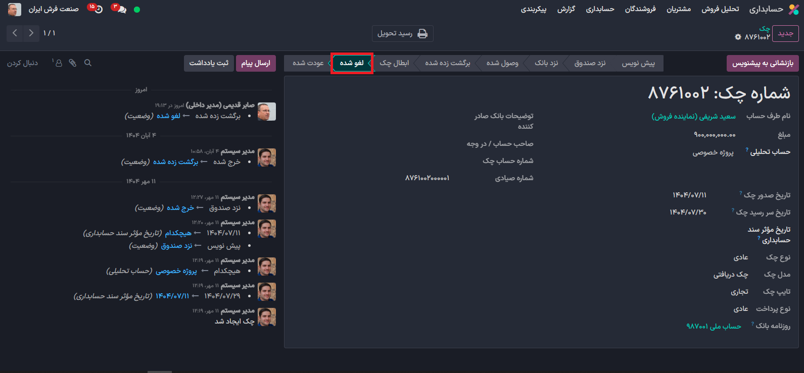 در صورتی شما کلید لغو را بزنید کلیه عملیات حذف می شوند و دیگر این چک سابقه ای نخواهد داشت می توانید این چک را با کلیک برر روی بازنشانی به پیش نویس مجدد فعال کنید و عملیات صحیح را روی آن ثبت کنید.