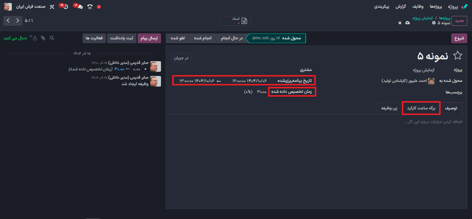 با کلیک کردن بر روی وظیفه جدید می توانید اطلاعات دیگر آن را کامل کنید و در قسمت برگه ساعت کارکرد می توانید زمان صرف شده بر روی این وظیفه را ثبت کنید.